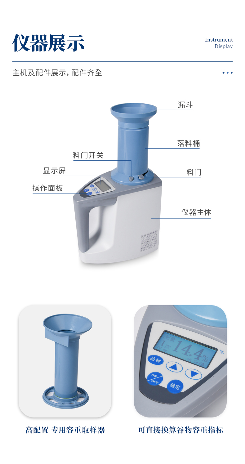 容重?fù)Q算:獨特的專利容重取樣裝置在精確測量小麥的同時,可以直接換算出小麥容重指標(biāo)。